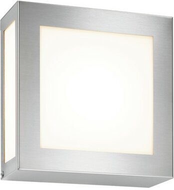 Edelstahl-Wandleuchte, Lichtaustritt nach vorne und seitlich, Opalglas, Bewegungsmelder ca. 180°, Zeiteinstellung ca. 10 Sek. - 12 Min., Reichweite: max. 8 m, ohne Leuchtmittel, 1x E27, max. 60W, HxBxT 22x22x9 cm, IP44