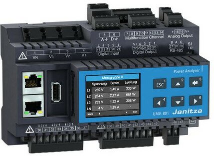 Modular erweiterbares Energiemessgerät UMG 801 zum Aufbau eines Energiemonitoring-Systems mit OPC UA Schnittstelle Hutschieneneinbaugerät, 145 x 90 x 76 mm (BxHxT) Versorgungsspannung: Externe Versorgungsspannung 24 V DC Messung in TN-, IT und TT-Netzen Messung von Oberschwingungen bis zur 127. Messdatenspeicher (4 GB) 3 Spannungsmesseingänge Messkategorie: 1000 V CAT III Messung in 3-Phasen 4-Leitersystemen bis 480 V/830 V (+-10%) nach IEC Messung in 3-Phasen 3-Leitersystemen bis 690 V (+-10%) 8 Strommesseingänge, aufgeteilt in 2 Viererblöcke Messkategorie: 300V CAT II Nennstrom 5A / 1A einstellbar Strommessbereich: 5 mA... 6 A Auflösung: 0,1mA 4 Multifunktionseingänge Wahlweise konfigurierbar als Differenzstromeingänge, Temperatureingänge oder Strommesseingänge Peripherie 4x Digitale Eingänge 4x Digitale Ausgänge 1x Analog Ausgang 2x Ethernet RJ45 Zubehör (inklusiv): 33.03.376 Installationsanleitung inkl. Sicherheitshinweise 52.31.205 Busverbinder Basisgerät (bereits aufgesteckt) 10.01.953 Endwinkel Programmiersoftware ? GridVis Essential? download: www.janitza.de/gridvis-download.html