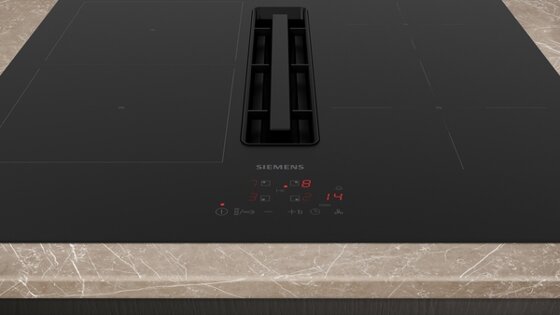 - Induktionskochfeld mit vollintegriertem, leistungsstarkem Downdraft-Abzugsmodul.