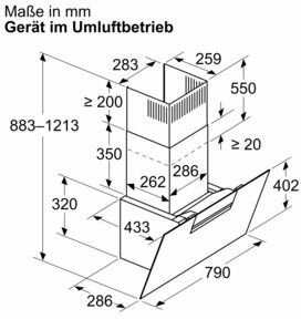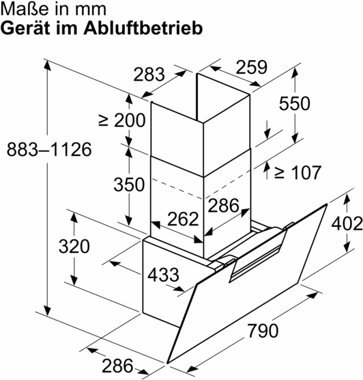 - Gerätemaße Abluft (HxBxT): 883-1126 x 790 x 433 mm