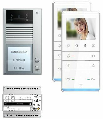 Vorkonfiguriertes Paket für 2 Wohneinheiten für den TCS:BUS bestehend aus: 1x Außenstation VPAK Color V2D 2Tasten AP EN, Artikelnummer: AVC12020-0010, vorprogrammiert, 2x TASTA V2D 3,5 Zoll Freispr. AP WS/WS, Artikelnummer: IVW5211-0145, 1x Video-2-Draht:BUS Versorgungsgerät, Artikelnummer: NVV1000-0400, Das Paket ist ab Werk vorkonfiguriert und bedingt erweiterbar, Die Funktionen der Innen- und Außenstationen können mit TCS-Serviceprodukten bedingt verändert werden, Die Komponenten unterstützen einen stand-alone-Betrieb
